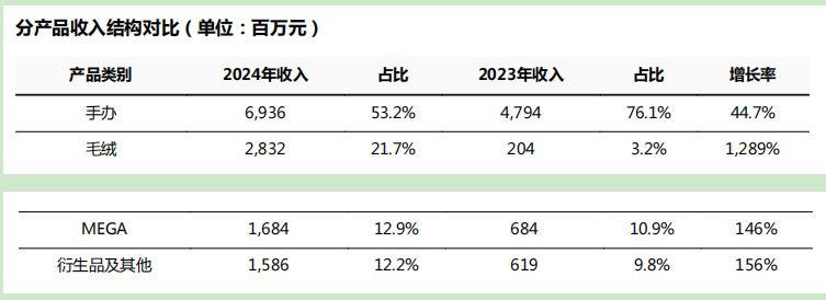 此外,泡泡玛特现在不仅卖盲盒,还搞起了毛绒玩具,2024年毛绒品类收入暴涨1289% 至28.3亿元。